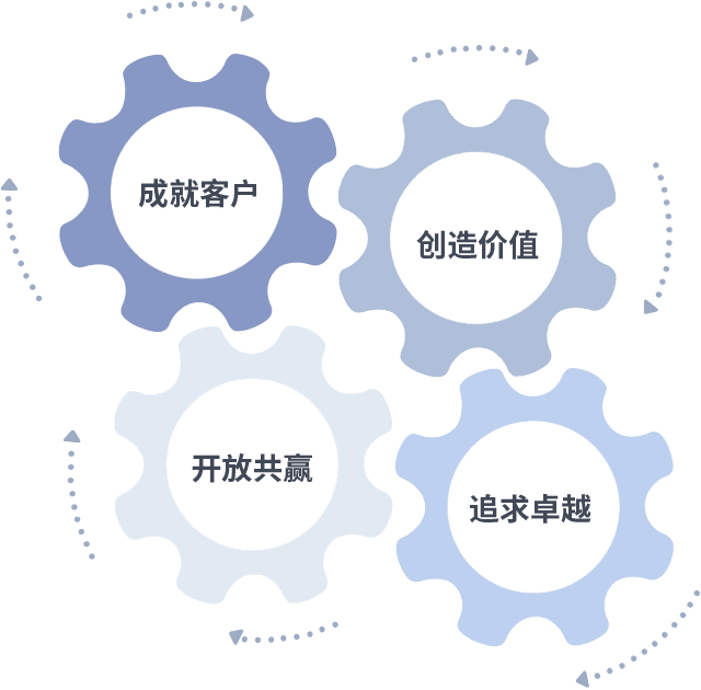 成就客户是一切决策的出发点,创造价值是衡量所有工作的标准,追求卓越是金狮贵宾会做事做人的态度,开放共赢是金狮贵宾会的格局也是最终的结果。价值观的齿轮环环相扣,推动着组织里的每个人不断向前。
